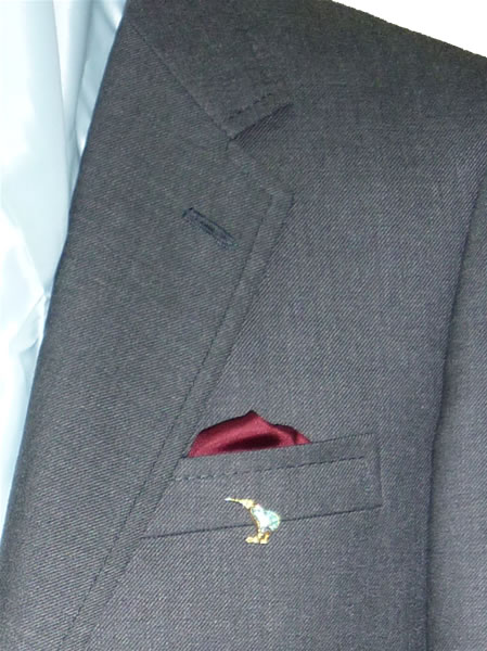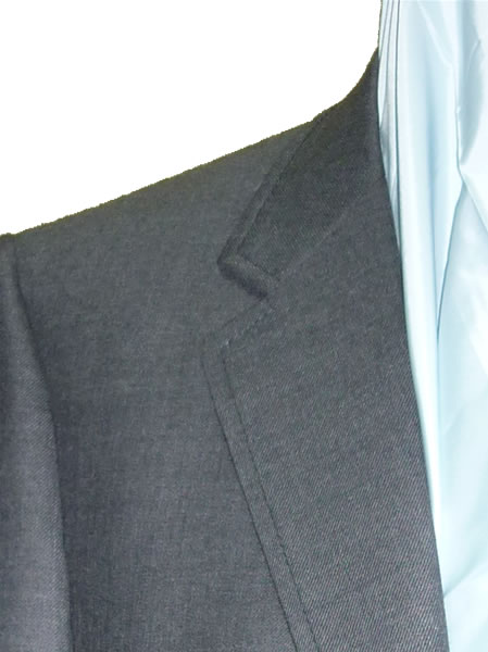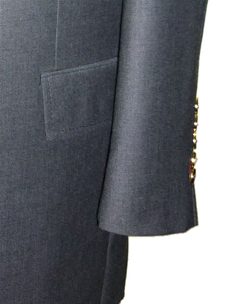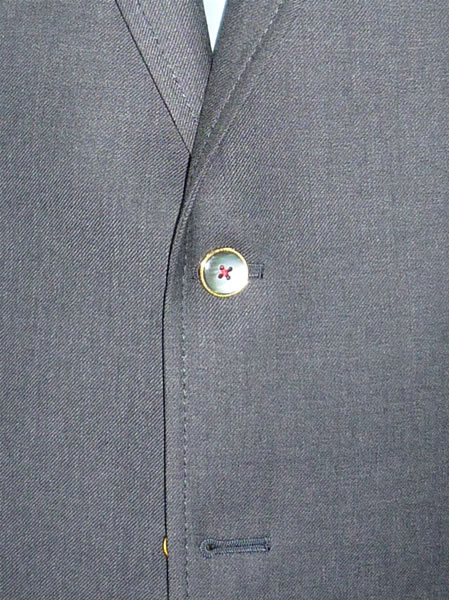 - 一見シンプルなグレースーツですが、フロントボタンを赤糸でクロス掛けにし、袖ボタンは5個本切羽にしました。
